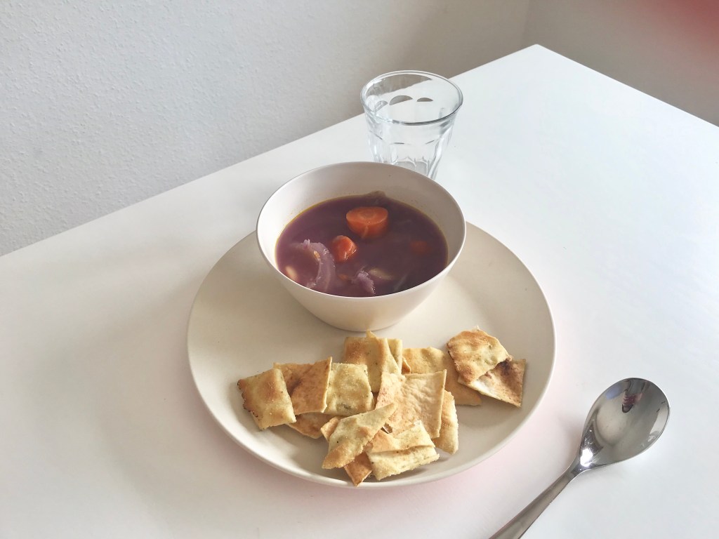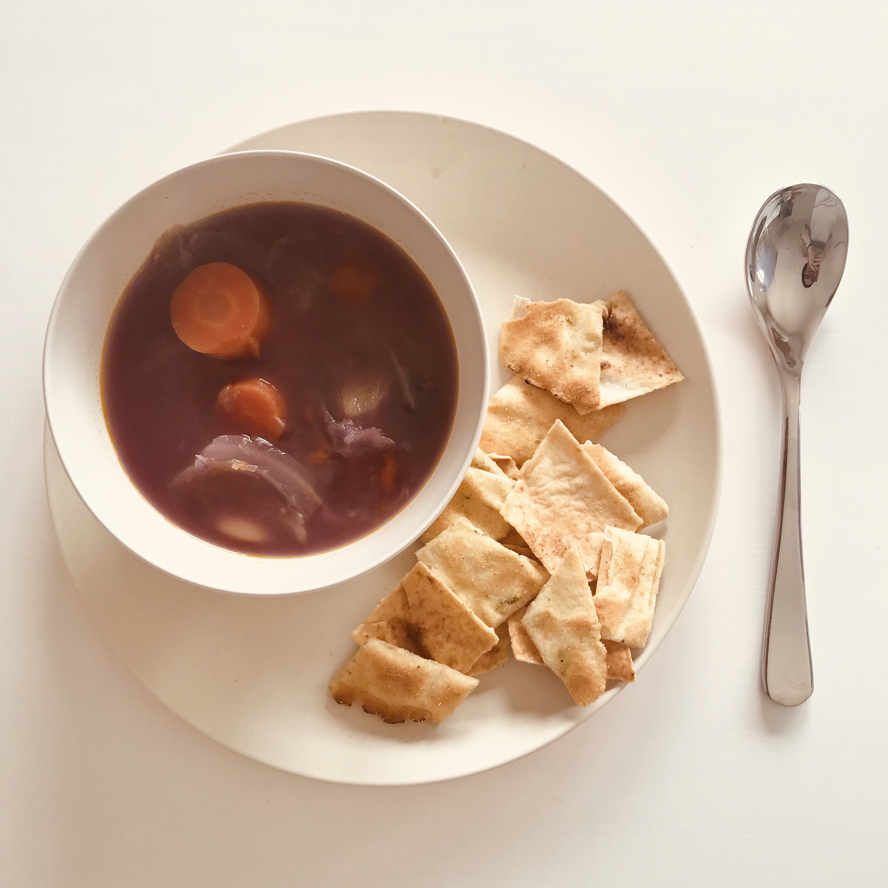 Quindi ho fatto una minestra/minestrone con le verdure che avevo in frigo: cavolo viola, cipolle, patate, carote e finocchio.